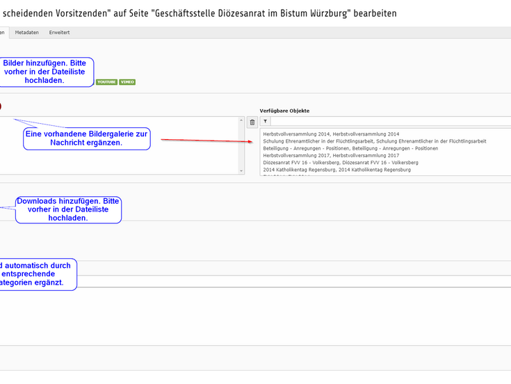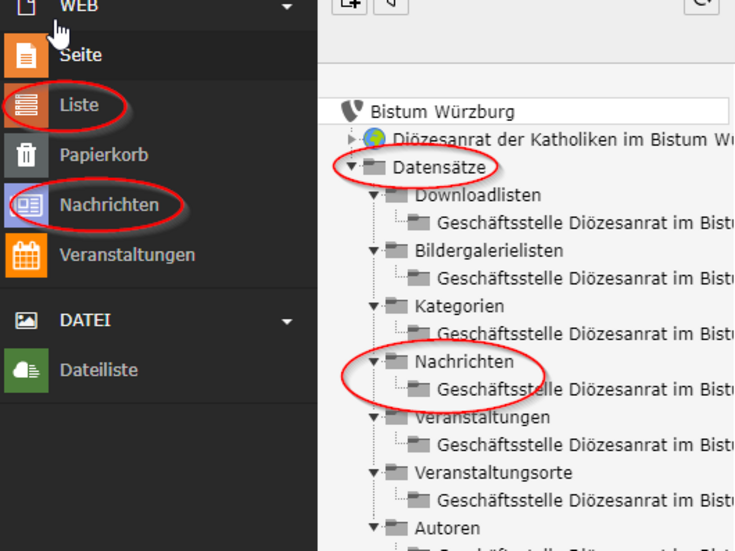 - Nach der Weltkugel mit den Inhaltsseiten folgt der Ordner Datensätze. In diesem Ordner finden sich weitere Ordner mit den jeweiligen Einträgen zu Nachrichten, Veranstaltungen und Veranstaltungsorte, Bildergalerien sowie Downloadlisten.